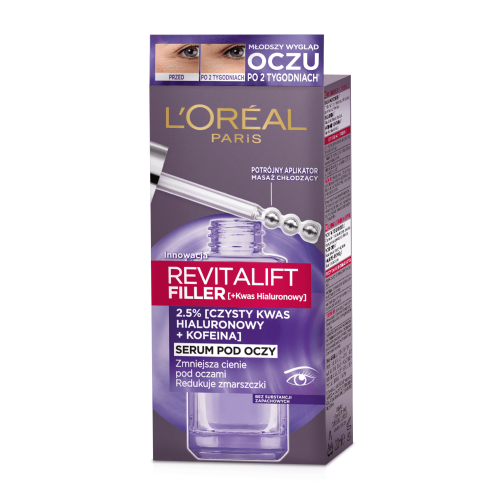 Mūsų pirmasis akių serumas praturtintas 2,5 % gryna hialurono rūgštimi ir kofeinu. Gryna hialurono rūgštis intensyviai drėkina ir mažina raukšles aplink akis, o grynas kofeinas padeda sumažinti tamsius ratilus po akimis. Formulė pagerinta niacinamidu ir vitaminu Cg – šios veikliosios medžiagos padeda pašviesinti paakių odą, kad ji atrodytų gaivi. Serumas turi trijų metalinių ritinėlių aplikatorių, kuris atlieka vėsinamąjį masažą ir padeda sumažinti akių vokų paburkimą. Poveikis? Akimirksniu: oda aplink akis pastebimai sudrėkinta, o akių zona atrodo gaivesnė. Po 2 savaičių: raukšlės po akimis išlyginamos. Tamsūs ratilai aplink akis matomai sumažėja. Po 6 savaičių: aplink akis sumažėja raukšlių (–21 %)*. 92 % moterų rekomenduotų naudoti šią priemonę**.
